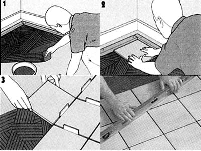 По уложенному слою раствора делают дополнительную укладку плитки. Раскладку плиток надо начинать со стены напротив двери и закончить у двери. Для выравнивания плиток, вдоль стен, которые перпендикулярные двери, укладываются маячки, рейки, бруски или специальный профиль, высотой пятнадцать — двадцать миллиметров.